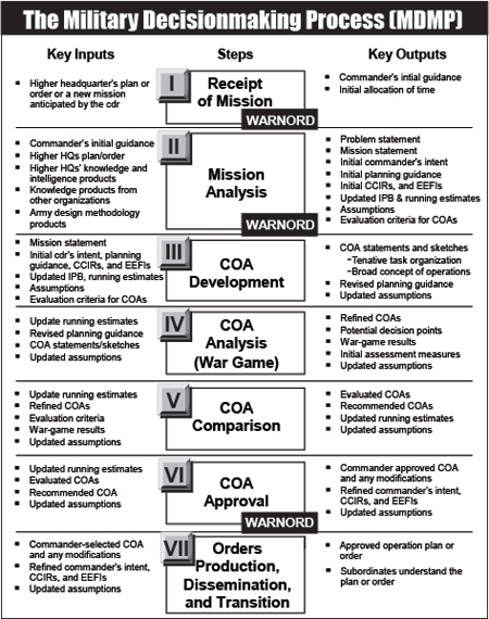 In the military, we generally live somewhere within the MDMP (Military Decision-Making Process)…and a whole lot of admin time. The reality, though, even the admin time can fit somewhere in the cycle because all of the appropriate boxes need to be checked before we can get to step one. The MDMP process consists of seven steps. AI defines them thusly: